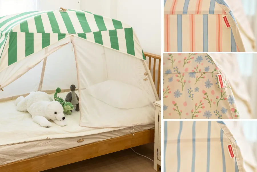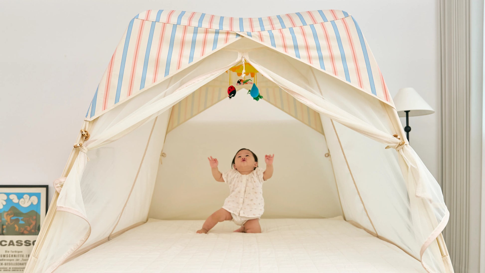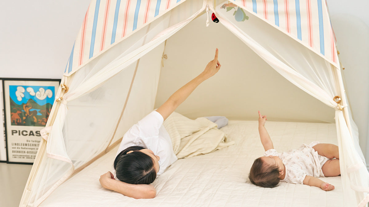 韓国で生まれたベッドの上に設置するテント型ベッドガードという新しいかたち。テントのように全体を包み込む設計で、ママとパパにとっては安心の空間に。子どもにとっては秘密基地のような空間に。