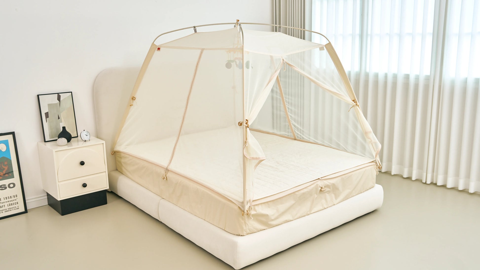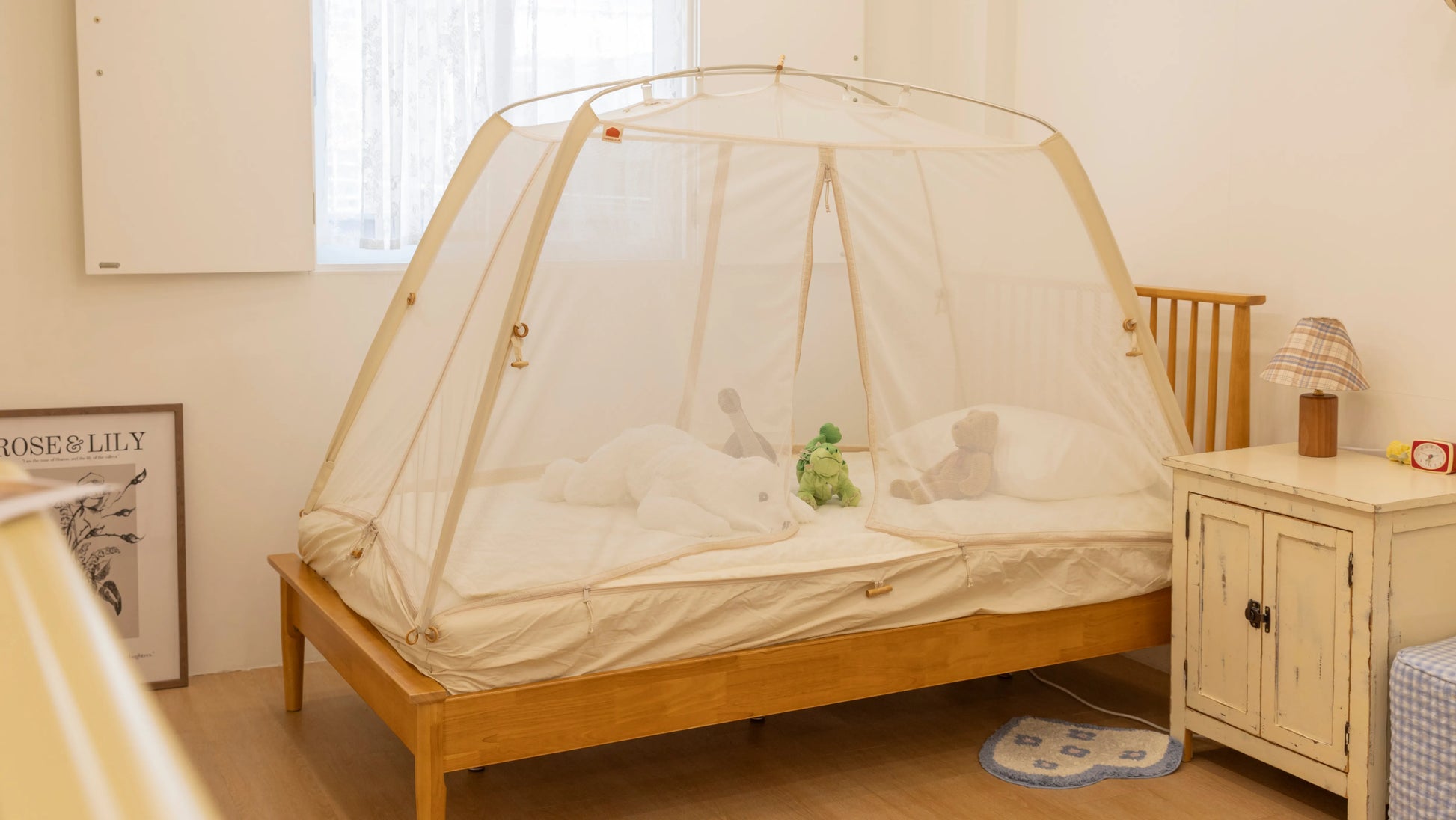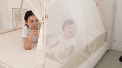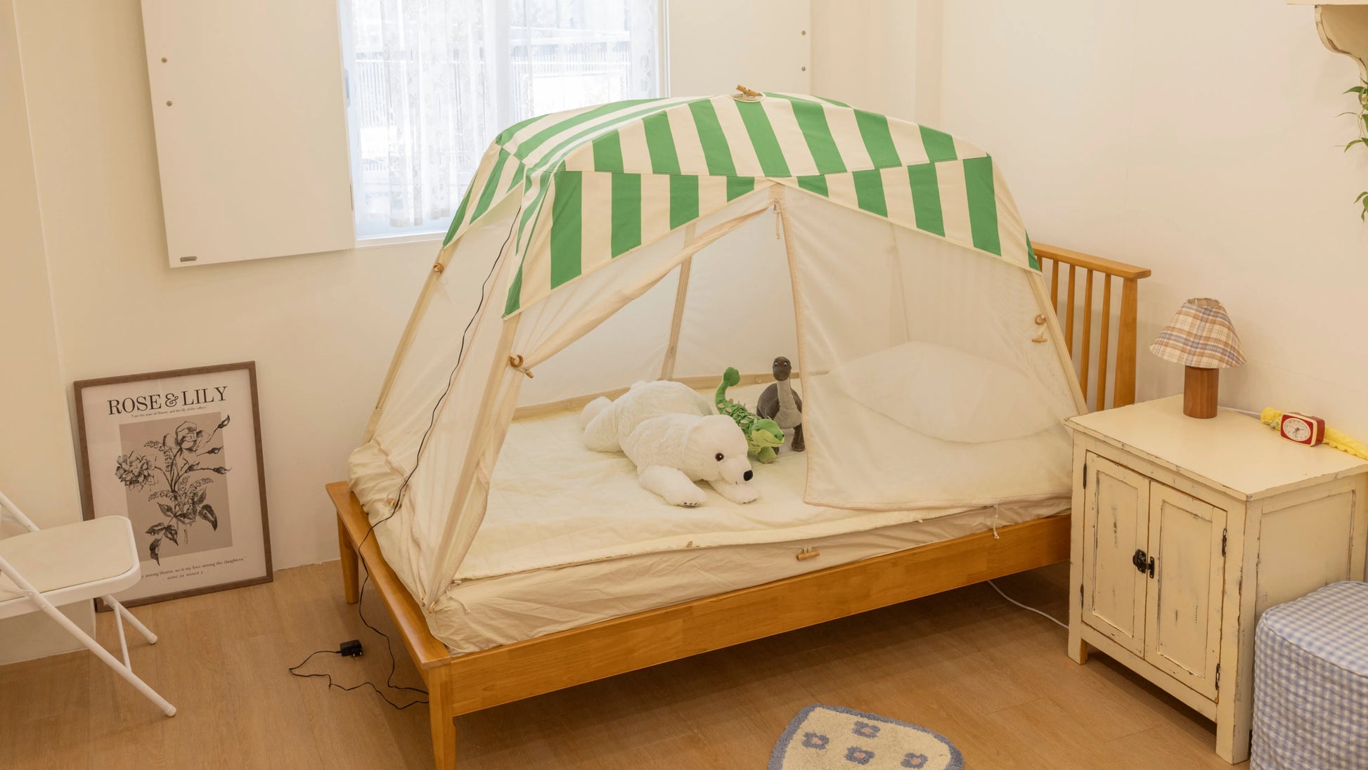 韓国で生まれたベッドの上に設置するテント型ベッドガードという新しいかたち。テントのように全体を包み込む設計で、ママとパパにとっては安心の空間に。子どもにとっては秘密基地のような空間に。